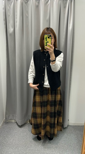パンツにもスカートにも合わせられるので、インナーを色々変えて楽しめます。