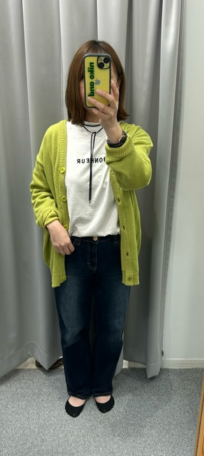 パーカはシンプルに普段使い出来て、カラーカーディガンはポイントに。