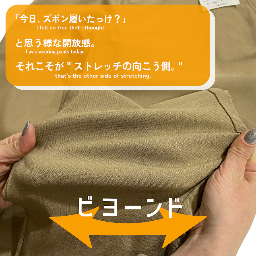 想像を超える伸縮性!! 〜あなたをストレッチの向こう側へとお連れ致します〜 JACKと言えば、この『ビヨンドシリーズ』と言っても過言ではありません。 こちらビヨンドパンツは、カジュアル要素だけじゃなく、お仕事用にブラックもご用意致しております。 そして、特徴としてはビヨ〜ンと伸びる最伸ストレッチ!! どんな動きにも対応してくれて、ズボンをはいているストレスはほぼなし。 特にウエスト周りはストレスを感じやすいですが、しっかりストレッチが細部まで効いているた…