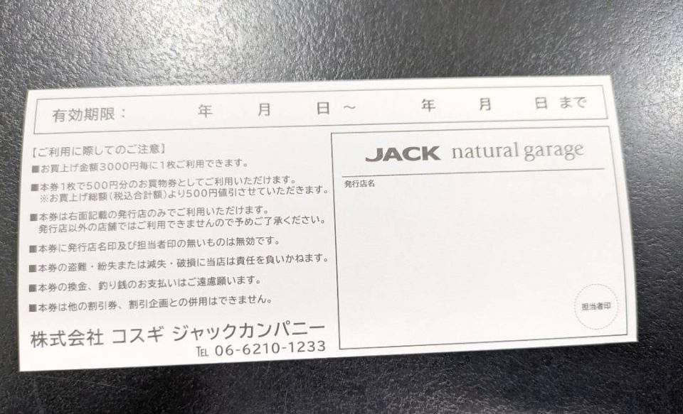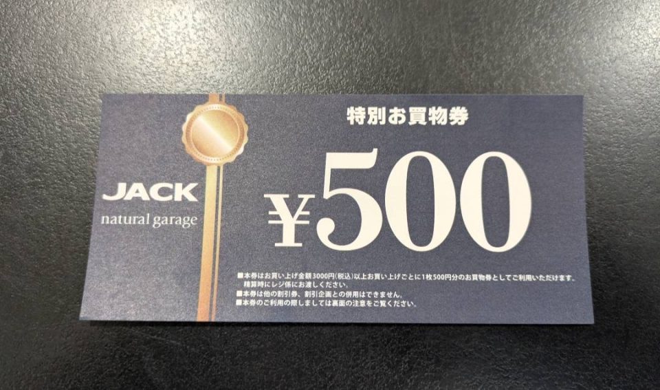 その際にJACKからお買い物商品券3000円毎に1枚(税込500円分)のお買い物商品券2枚1000円分を次回以降のお買いもので利用頂ける商品券をお配りしています。