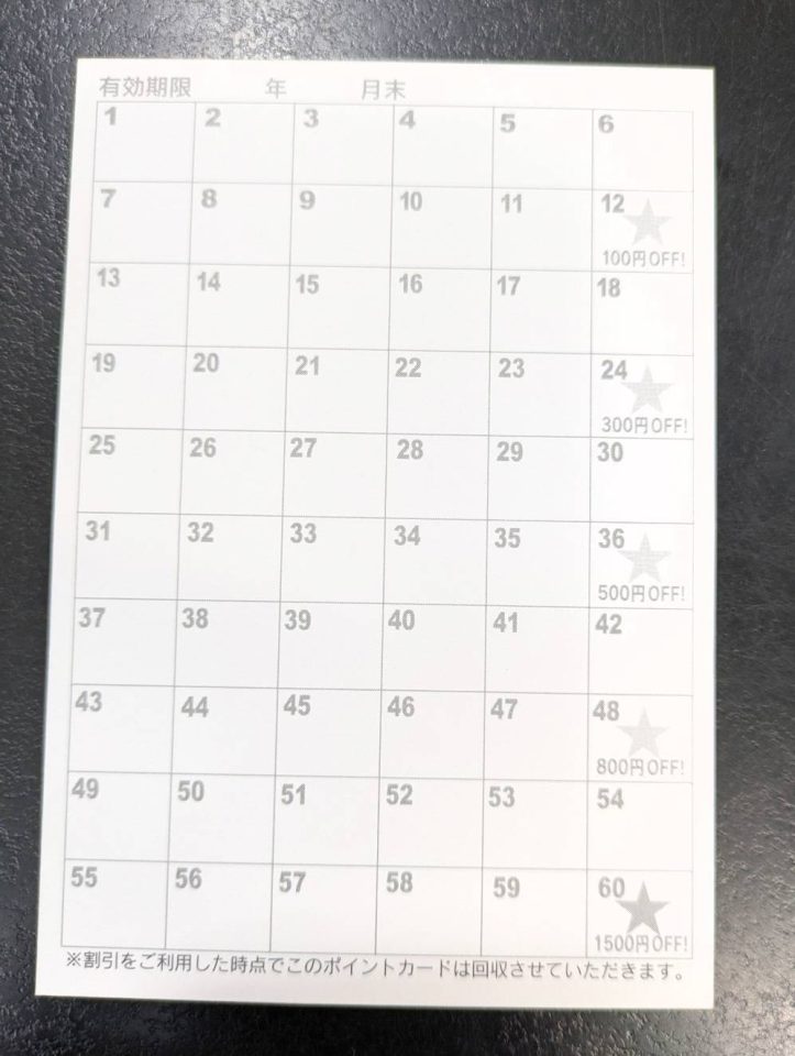 お買上金額500円毎に1個のスタンプが押せて、発行日より有効期限2年間で60個溜まると1500円分の割引券として利用頂けるカードなんです。