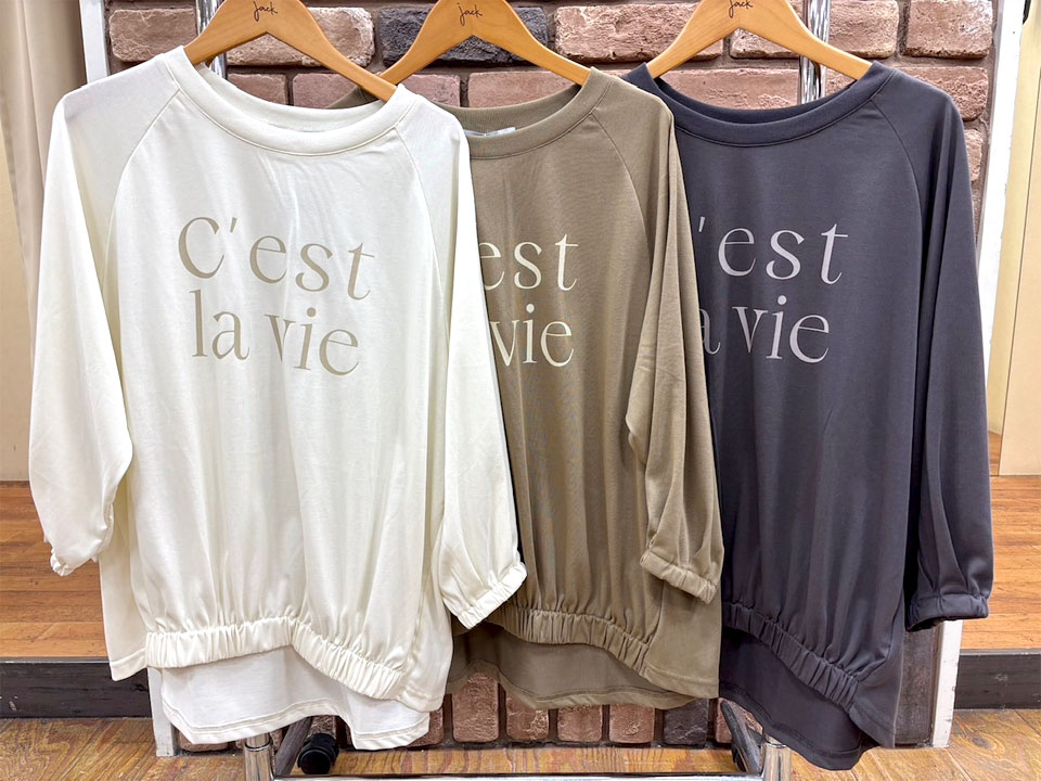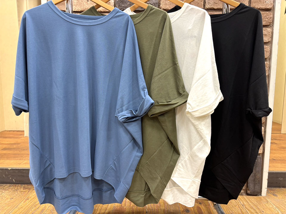 ちょっと丈短めで、前が上がったデザインは、パンツでもスカートでも前だけインしてるように見えてこなれた感じが出せます。