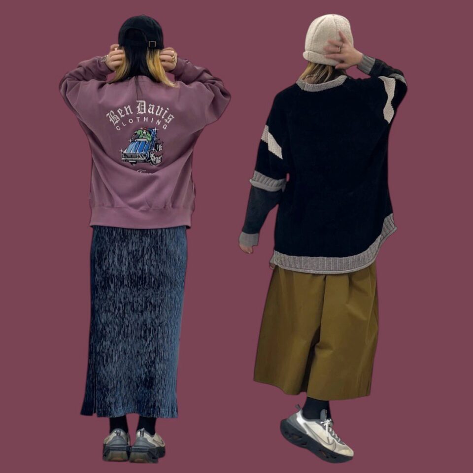 左のコーデはBENDAVISの裏起毛トレーナー