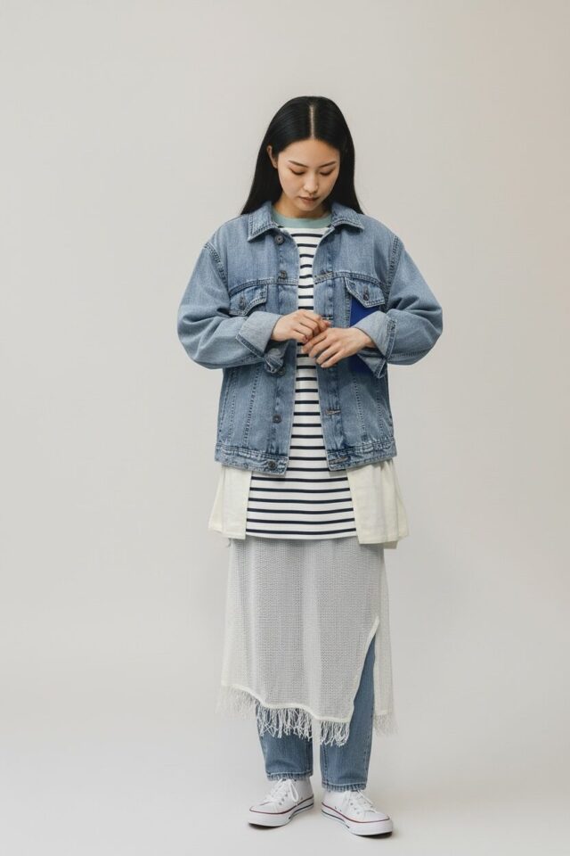 ・デニムジャケットの下に白のジャケットを挟んでおしゃれ見えするようにしたこと
