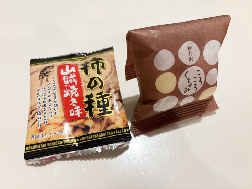 「柿の種 山賊焼き味」と「ころころくるみ」です。