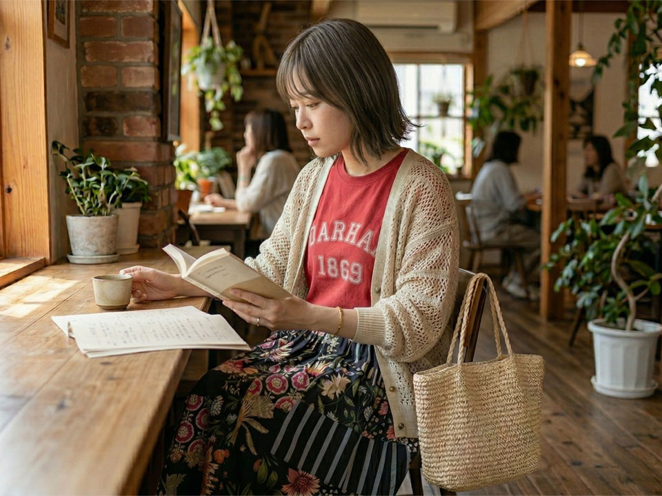 これが個人的にイチオシです!赤のカレッジロゴTシャツにライトカラーの透かし編みカーディガンをゆるっと羽織って、かごバッグを合わせるスタイル。スカートが華やかな分、トップスをカジュアルにまとめるとちょうどいいバランスになります。甘すぎず、かといってカジュアルすぎず、こなれ感が出るコーデ。お出かけにもカフェ巡りにもぴったり♪