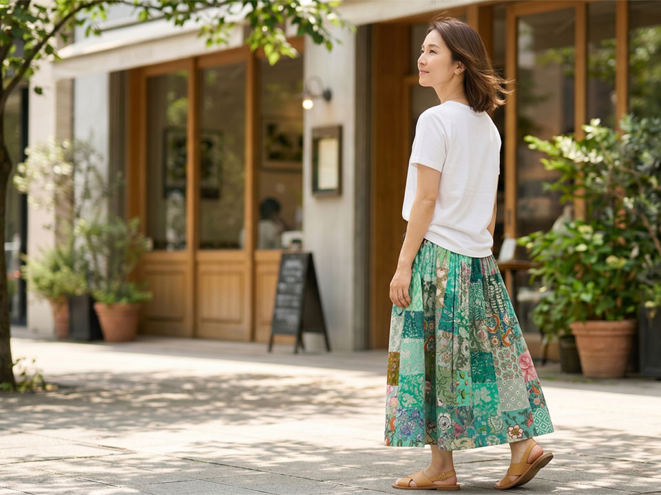 そんなパッチワークのスカートは主役にして、この春夏コーデを楽しんでもらいたいです。