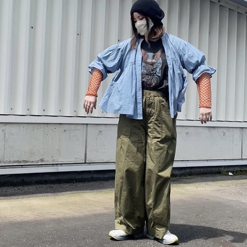 ・青みのあるデニムシャツを巻いて少し色味を落ち着かせました。