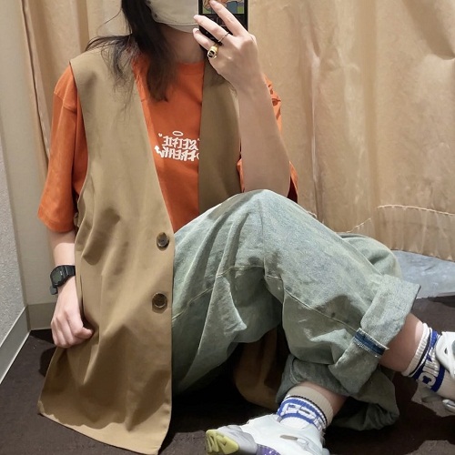 - ベストを上に羽織って縦のラインに目がいくように。