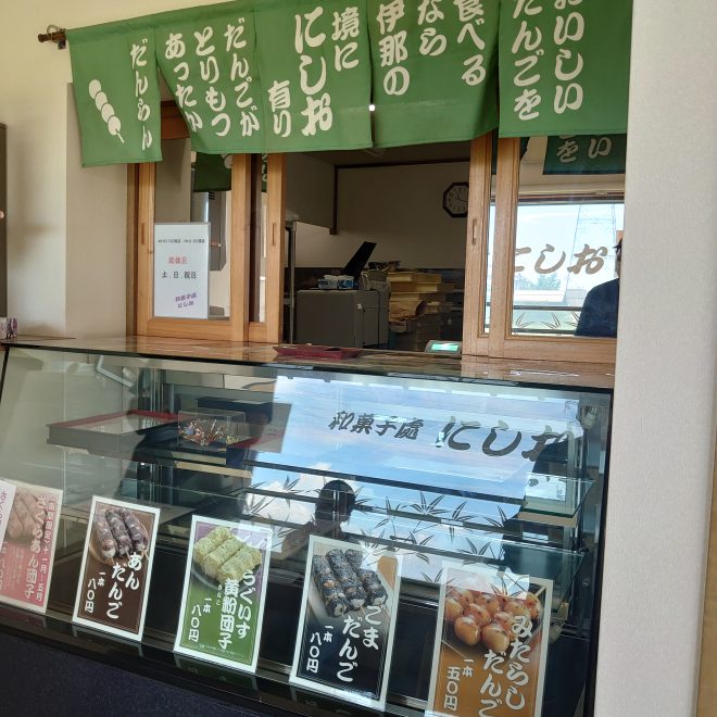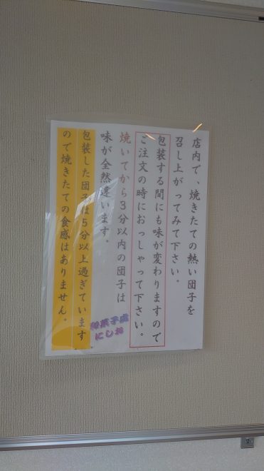 焼いてから3分以内のお団子は味が全然ちがいますの貼り紙。