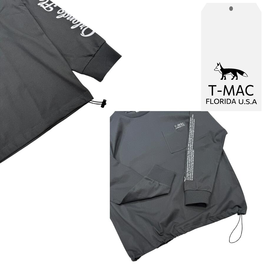 表面の胸元にはT-MACのロゴがポケットの上にワンポイント刺繍でデザインされ、