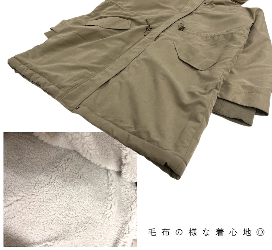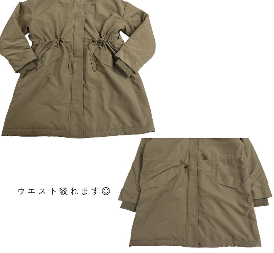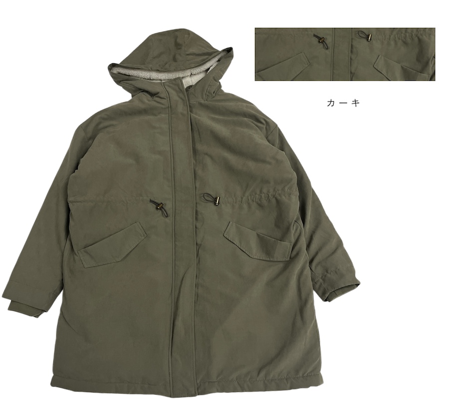 大きめのフードとドローコードがアクセントになり、ミリタリーライクなモッズコート風デザインでスタイリングにこなれ感をプラス。