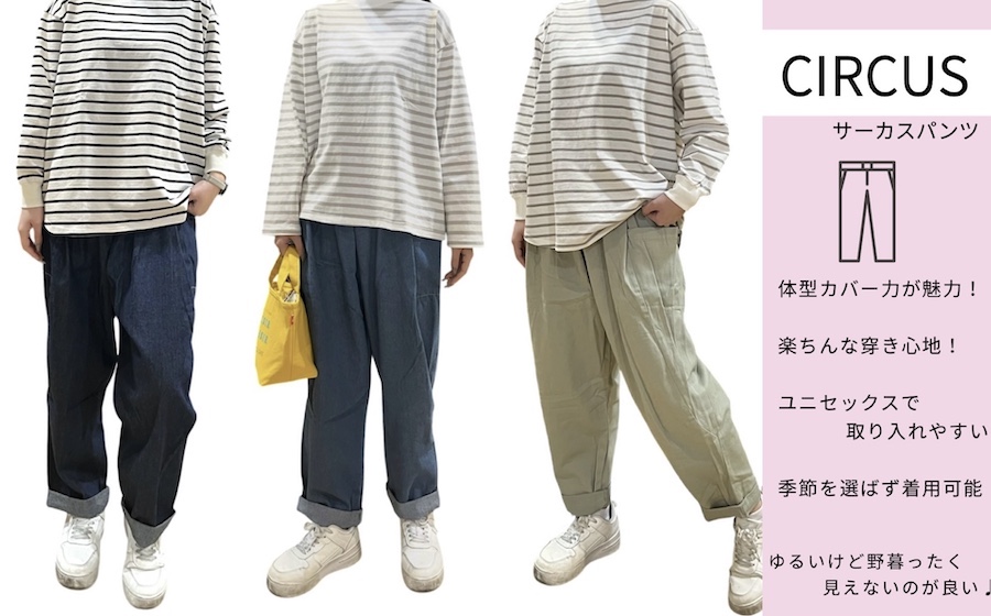 鉄板ボトムのサーカスパンツは、ウエストゴムで履き心地が抜群!