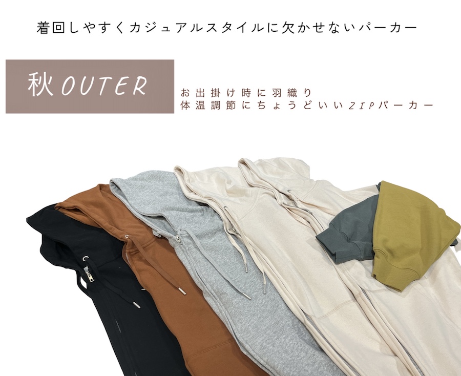 NEW お出かけ時の羽織り、体温調節にちょうどいいジップパーカー!